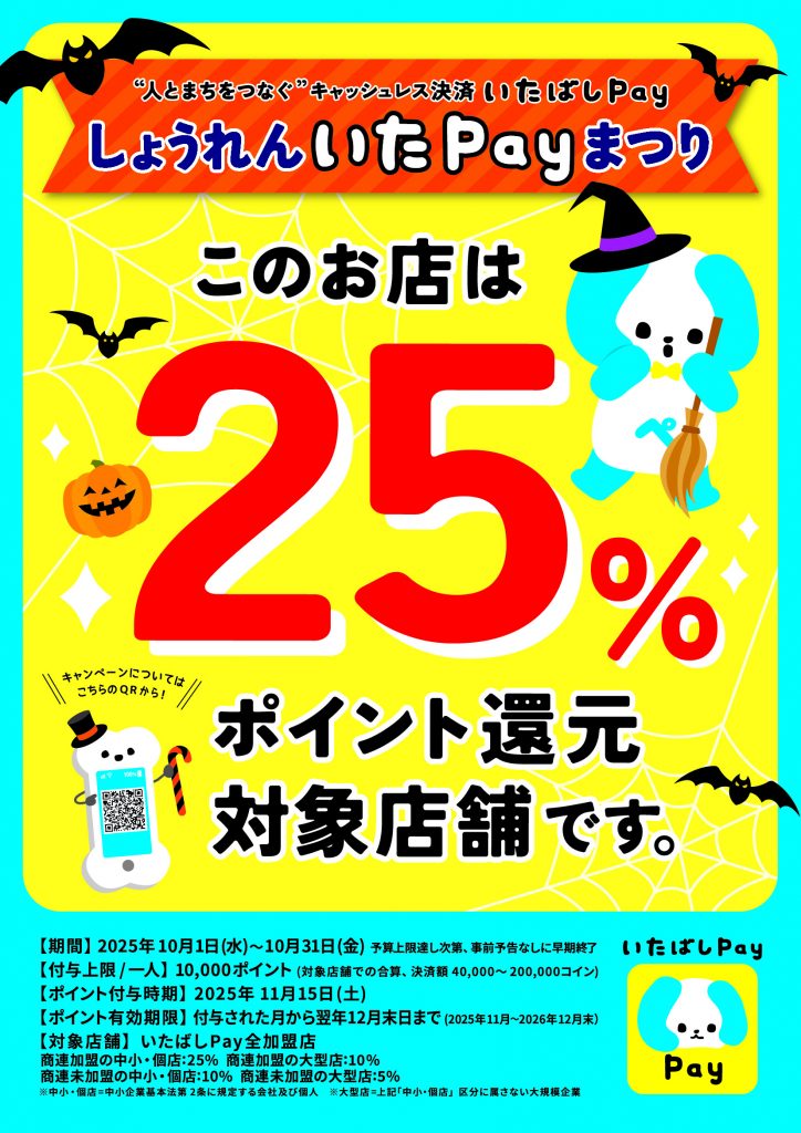 ◆ 10月は「しょうれんいたPayまつり」!当店は25%ポイント還元店舗です!!